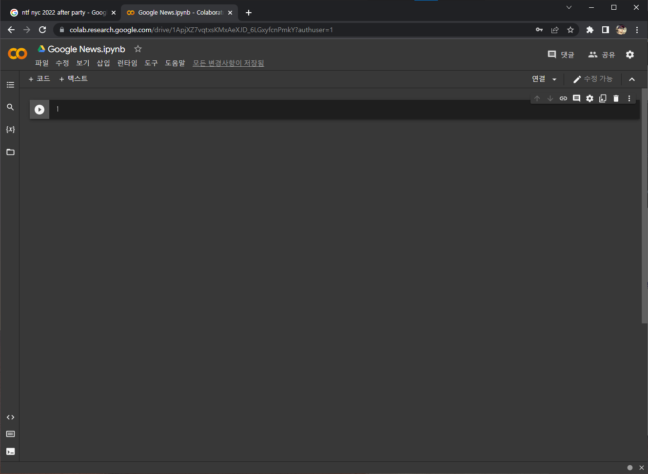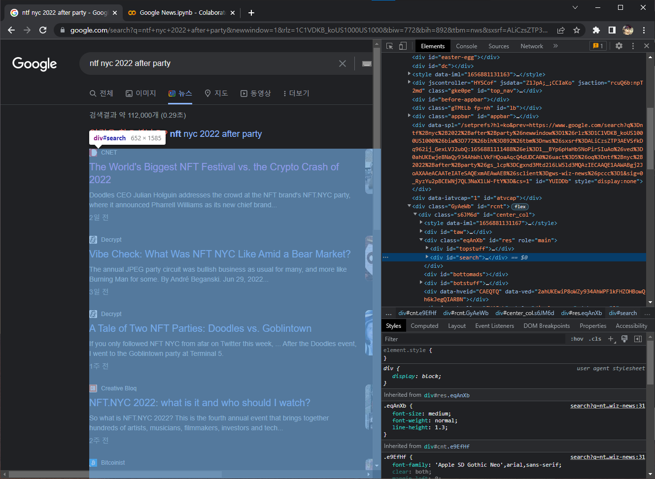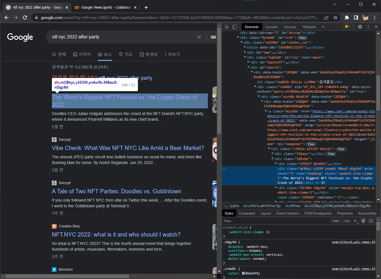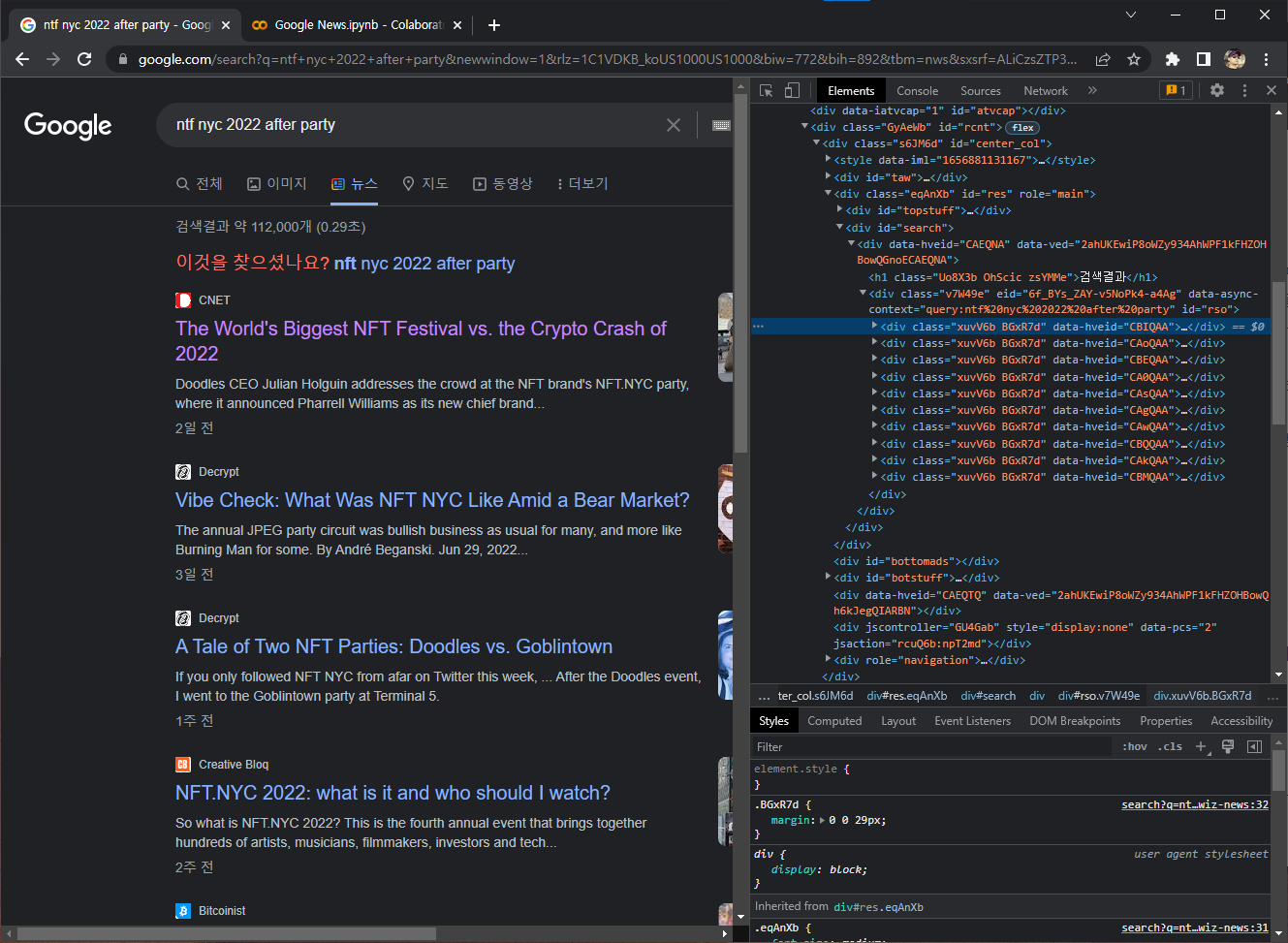 'nft nyc 2022 after party' 라는 키워드로 구글링한 후, 뉴스탭으로 이동해 이 키워드로 검색되는 뉴스의 제목과 링크를 크롤링 하겠다.
