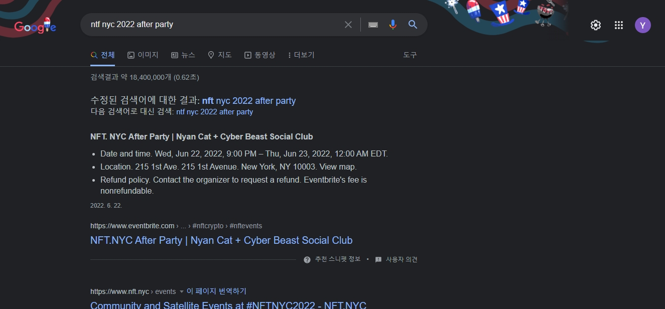 구글 검색창에 'nft nyc 2022 after party'를 넣고 구글링한 후 뉴스탭으로 이동한다.