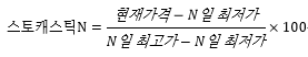 스토캐스틱은 1950년대에 조지 래인(George Lane)이 알린 지표이다. 지표의 컨셉은 최근 N일간 주가 범위 중 현재 주가가 얼마나 높이 있는가 이다. 공식을 보면 컨셉이 바로 보인다.