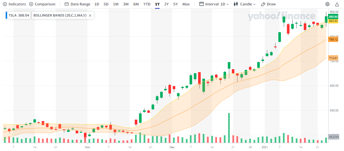 볼린저 밴드는 이동평균에 변동성을 결합한 그래프이다. 차트의 모양은 지난 시간에 살펴본 엔벨로프와 매우 흡사하다. 아래 그림은 테슬라 주가와 볼린저 밴드가 표시된 차트인데, 오랜지색 구간이 볼린저 밴드이다. 이동평균선이 밴드의 중심축이 되고, 밴드의 상단과 하단은 이동평균±표준편차로 표시한다.