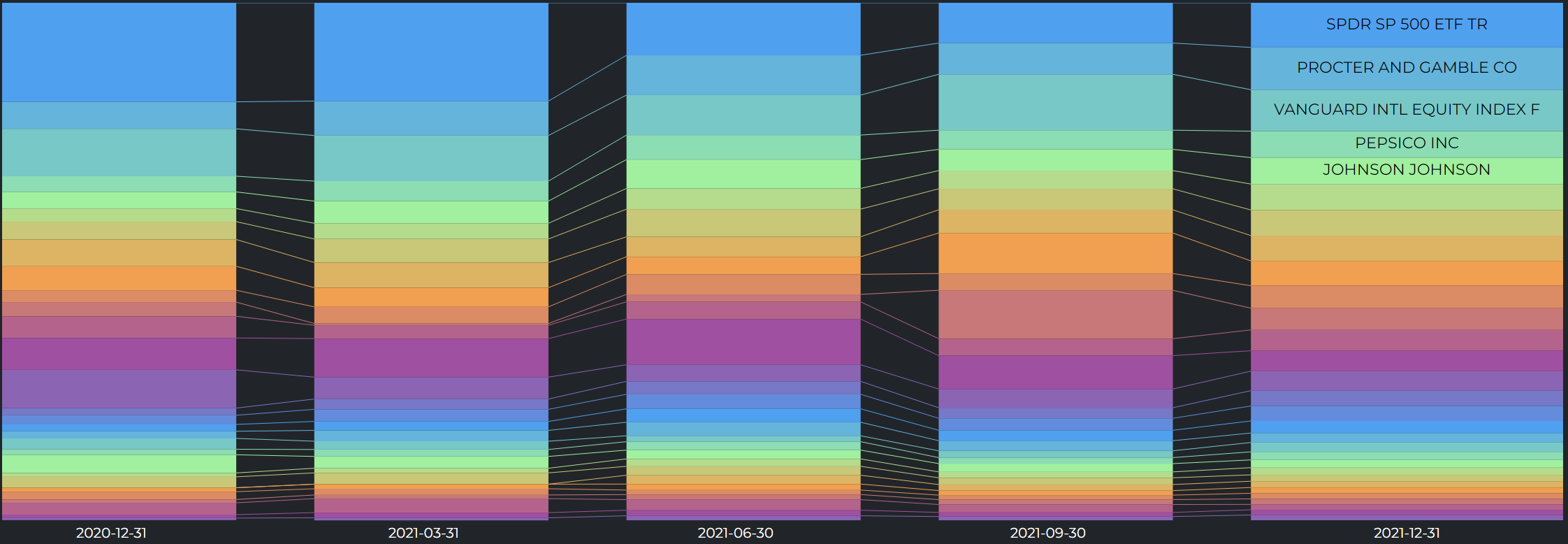 2021년 12월 31일 기준, 브릿지 워터는 총 731 종목을 갖고 있다. 버크셔 해서웨이와는 달리 보유종목이 다양하게 분산되어 있고, 그 와중에도 가장 많이 들고 있는 종목은 S&P 500 전체에 투자하는 ETF SPY이다.