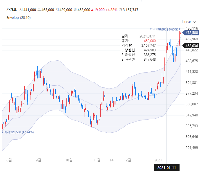 엔벨로프 지표는 현재 가격이 이동평균 가격보다 얼마나 많이 떨어져 있는지 한눈에 알아보기 쉽다는데 그 의미가 있다. 위 차트에서 1월 11일을 보자. 캔들이 엔벨로프 위에 있으니, 그 날의 주가는 이동평균보다 10% 이상 올라가 있난, 엄청나게 상승한 날이다. 위 그래프에는 없지만, 캔들이 엔벨로프 아래 있으면 그날은 주가가 많이 빠진 것이다.