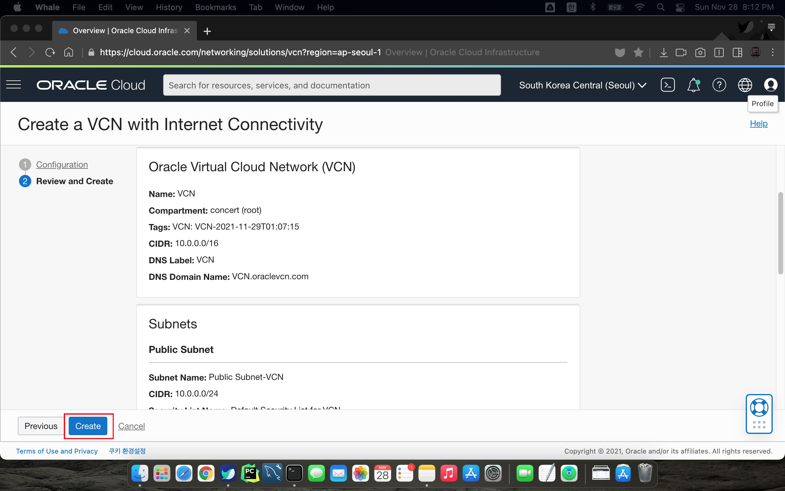 입력한 내용을 확인한 후 Create 버튼을 누르면 완료. 필자는 VCN 이름을 VCN 으로 지정했다.