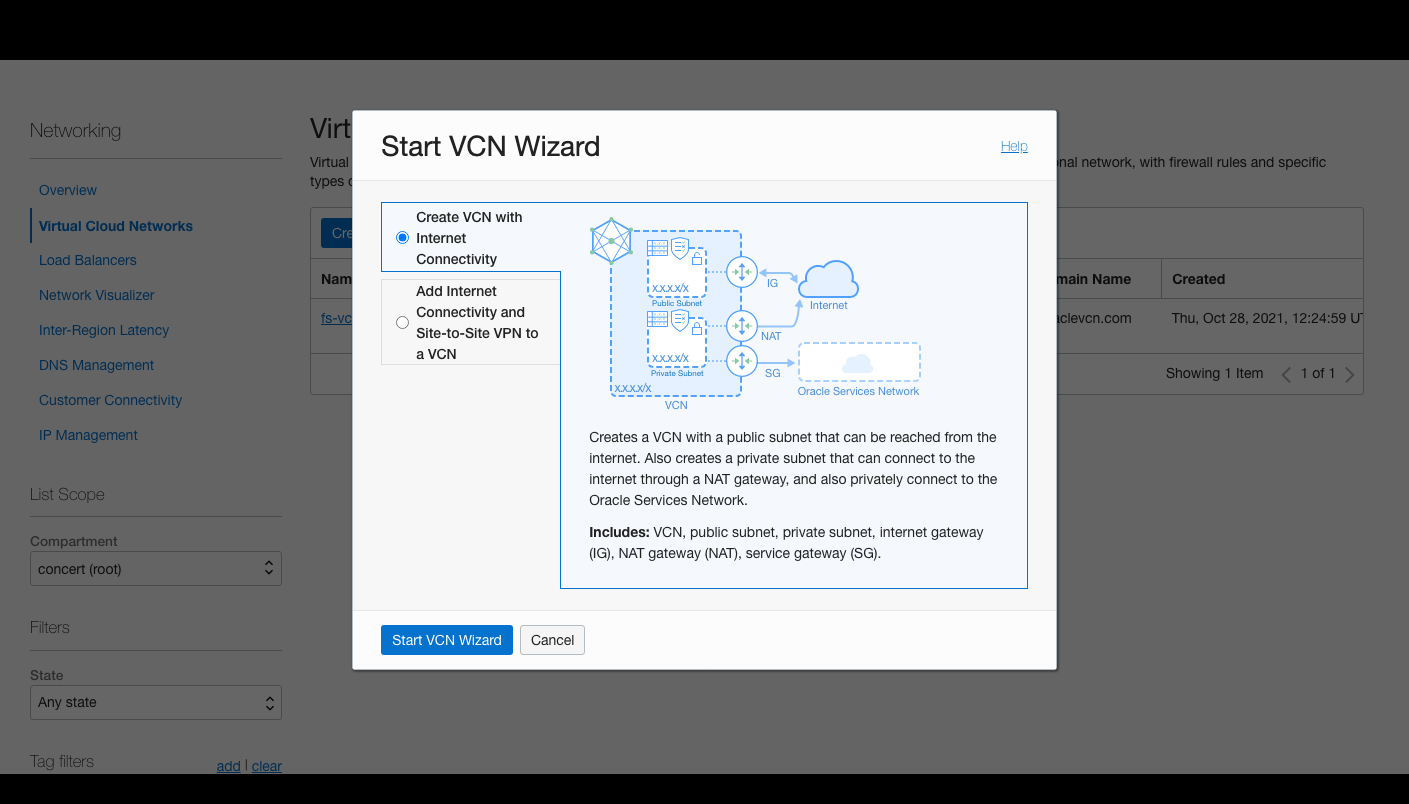 Start VCN Wizard 를 클릭.