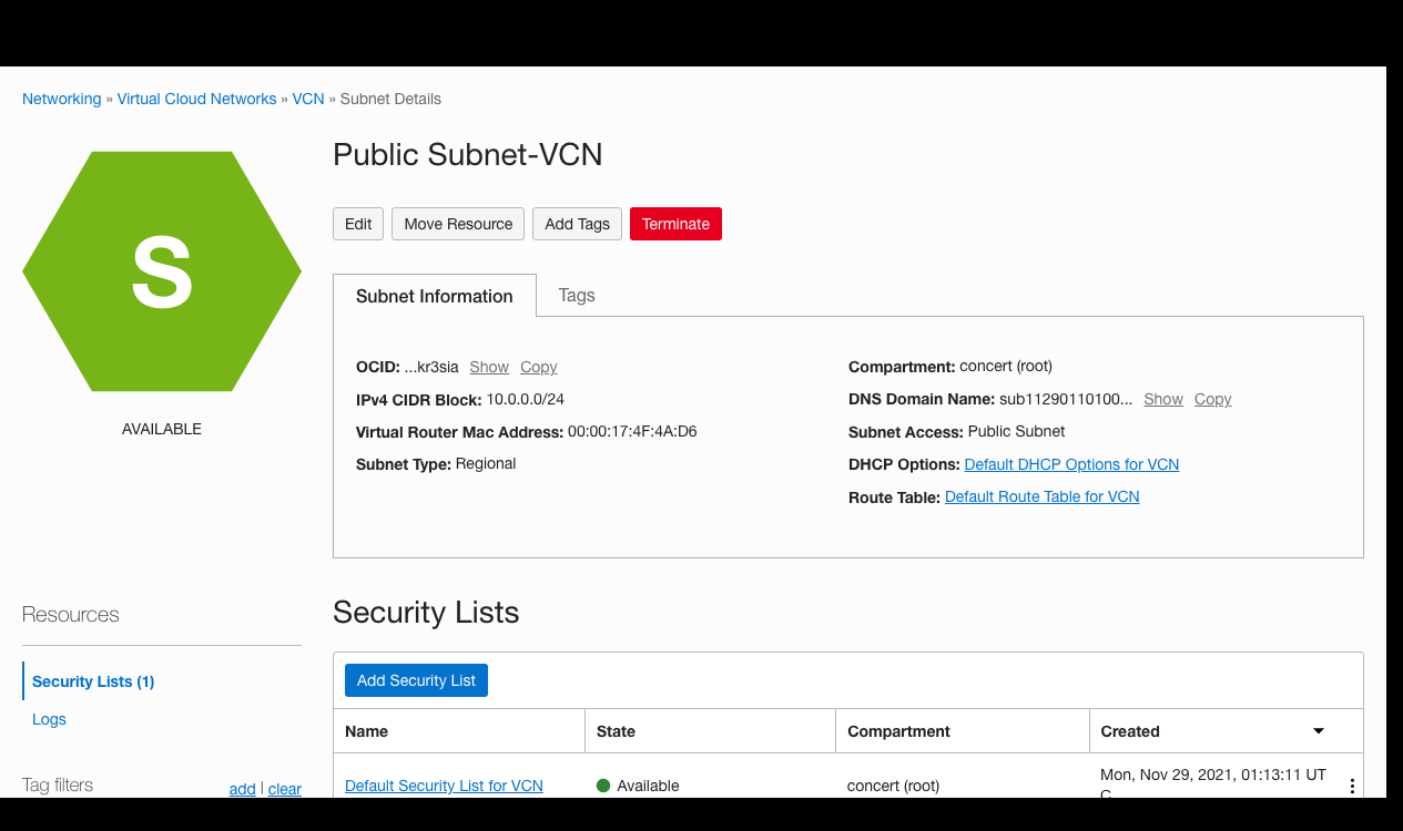 방화벽 설정으로 들어가기 위해 Public Subnet-VCN 을 클릭해 Public Subnet-VCN 화면에 들어간 후,