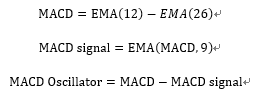 복잡해 보이지만 어려운 식은 아니다. 오늘의 지수이동평균은 오늘의 주가와 어제의 지수이동평균값의 평균인데, 오늘 주가에 조금 더 가중치를 준거다 정도로 이해하면 충분하다. 이렇게 지수이동평균값을 구하면, 이를 이용해 아래와 같이 MACD 및 그 보조지표를 구한다.