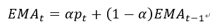 이동평균이라는 것이 과거 일정 시점부터 지금까지의 평균 주가를 가지고 구하는 값이라, 이동평균을 이용해서 주가 추이를 관찰하다 보면 실제 추이보다 어느 정도 늦어질 수밖에 없는데, MACD를 개발한 제럴드 아펠(Gerald Appel)은 이를 극복하기 위해 하나의 트릭을 추가했다. 이동평균을 구할 때 단순이동평균(MA)이 아닌 지수이동평균(EMA, Exponential Moving Average)을 사용한 것이다. 단순이동평균은 누구나 아는 가장 기본적인 평균값이고, 지수이동평균은 최근 값에 더 높은 가중치를 주고 계산한 평균값이다. 지표가 주가 추이를 조금이라도 더 빨리 감지하도록 하기 위해 지수이동평균을 이용한 것이다. 지수이동평균을 구하는 식은 아래와 같다.