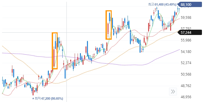 앞서 본 삼성전자 캔들차트의 주황색으로 표시된 부분에서는 파란색으로 표시된 날짜의 주가가 분명 전일보다 상승한 상태로 마감하긴 했지만, 그 당일만을 놓고 봤을때는 훨씬 높은 가격에서 시작했다가 내려온 가격으로 마감한 것이다.