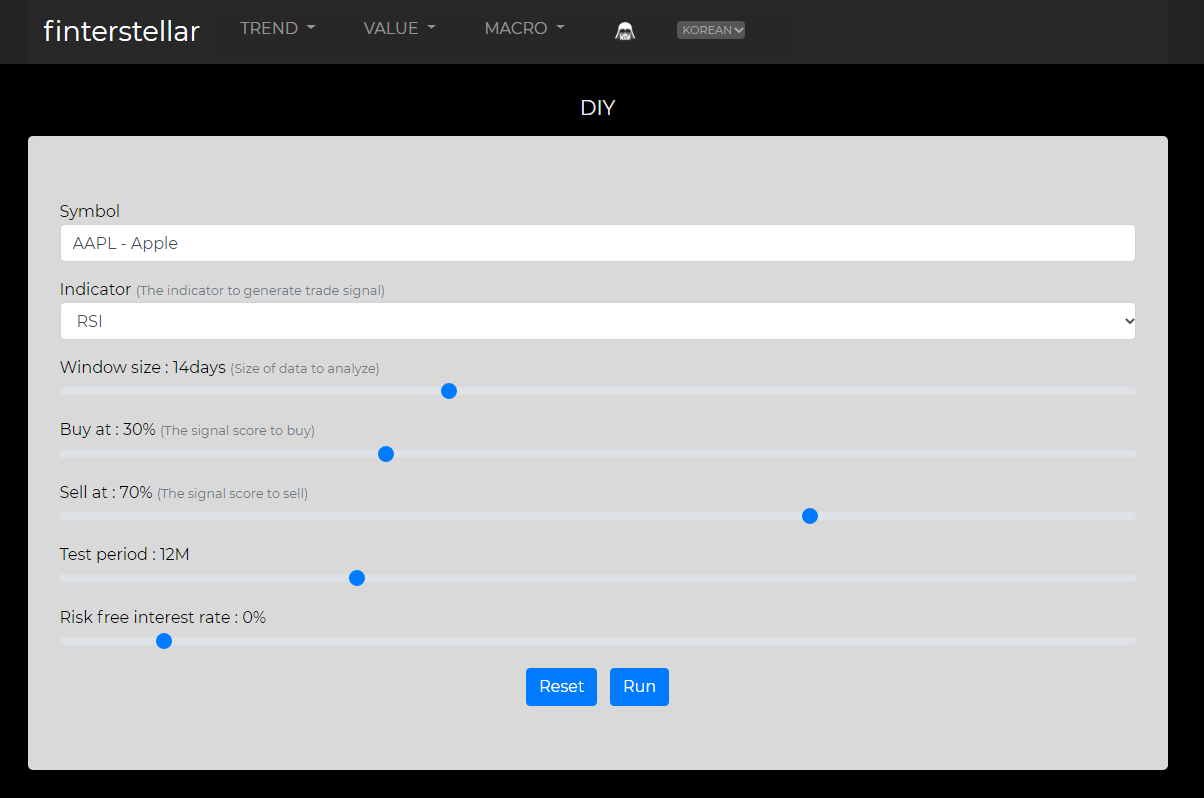 핀터스텔라 백테스트 기능을 이용해 RSI 전략의 성과를 테스트해보자. https://www.finterstellar.com/diy/backtest_single 에 접속해 로그인하면 투자 전략을 테스트해볼 수 있다. 아래 그림에서는 애플 종목의 RSI 전략을 백테스트한다. Window size는 14일을 기준으로 하고, RSI 값이 30 이하에서 Buy, 70 이상에서 Sell 하는 와일더의 추천 전략대로 매매한다. Test period는 1년으로 하고, 수익률 계산에 사용되는 Risk free interest rate는 현재 미국 금리인 0%로 세팅한 후 Run 버튼을 눌러 실행한다.