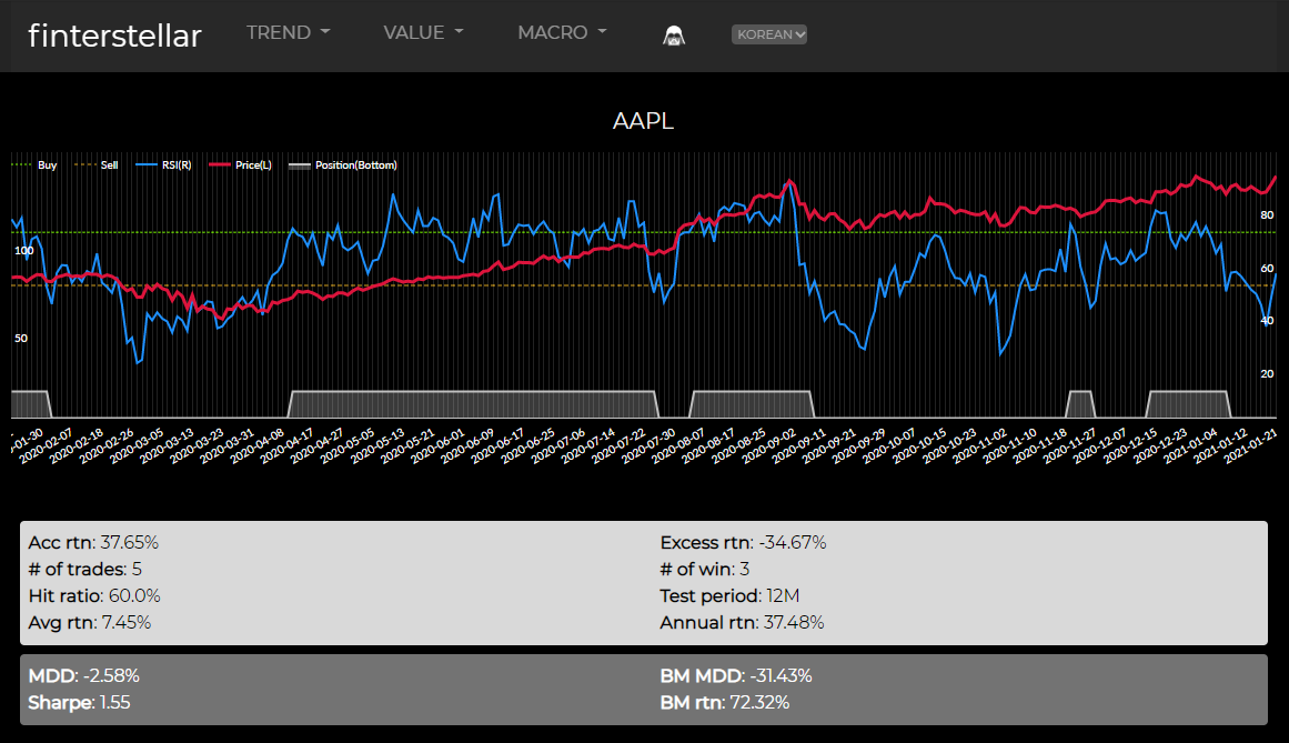 RSI를 이용한 투자전략도 여러 가지가 나와있다. RSI에 더해 RSI indicator라는 보조지표의 보조지표까지 만들어서 mix & match 해서 투자하는 전략도 있다. 그런데 그 전략도 테스트 결과 대부분 이렇게 실망스럽기 짝이 없는 결과를 보여줬다. 장기적으로 주가가 우상향 하는 주식은 매수해서 쭉 들고 있어야 수익이 나지, 이렇게 들락날락하면 성과가 좋지 못하다는 증거다.