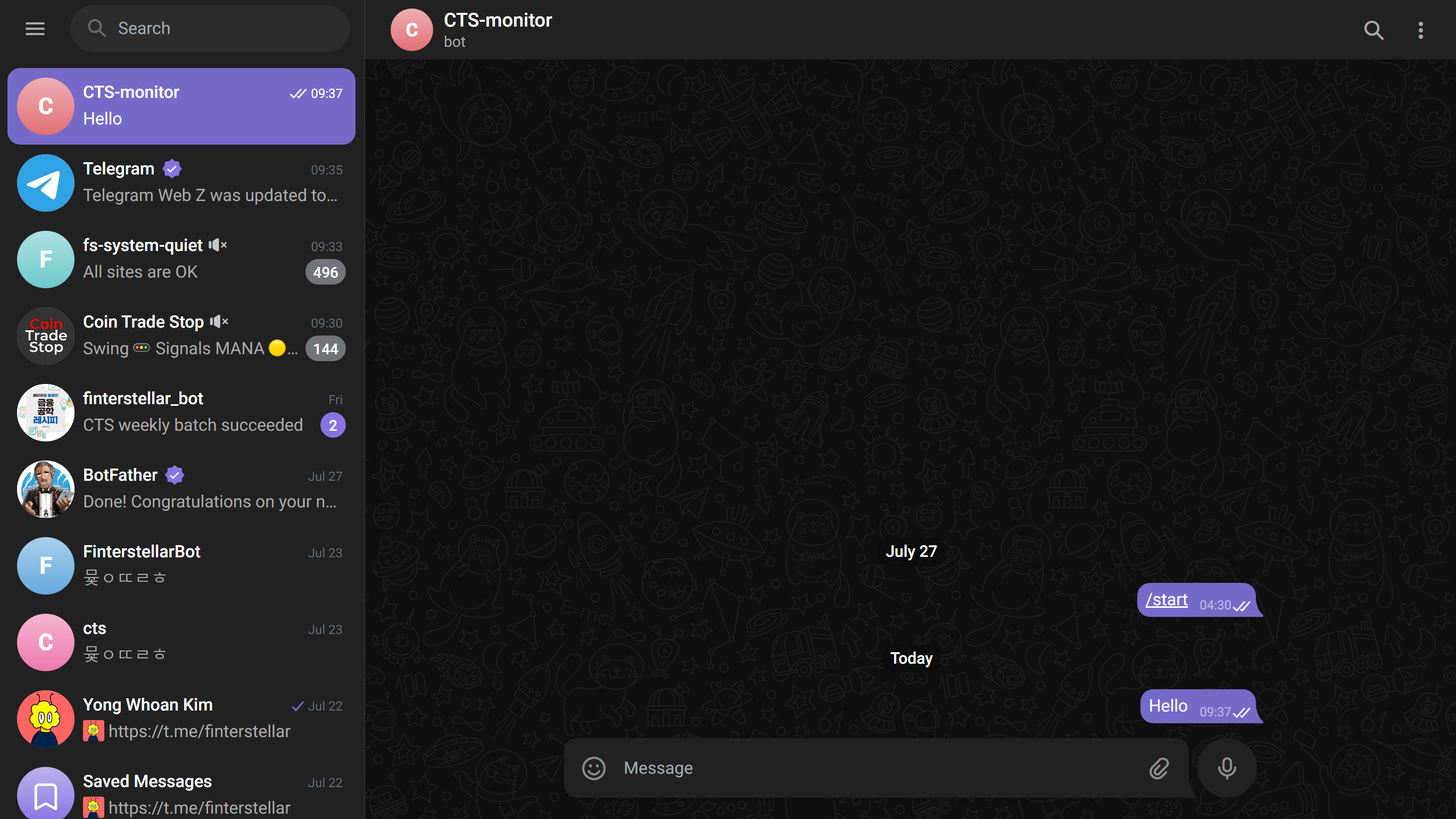 이제 방금 만든 봇과 대화를 시작하자. 검색창에 봇 이름을 넣고 검색해 대화방을 만들어도 되고, 앞에서 BotFather가 알려준 링크 t.me/CTS_monitor_bot을 클릭해 대화방을 만들어도 된다.