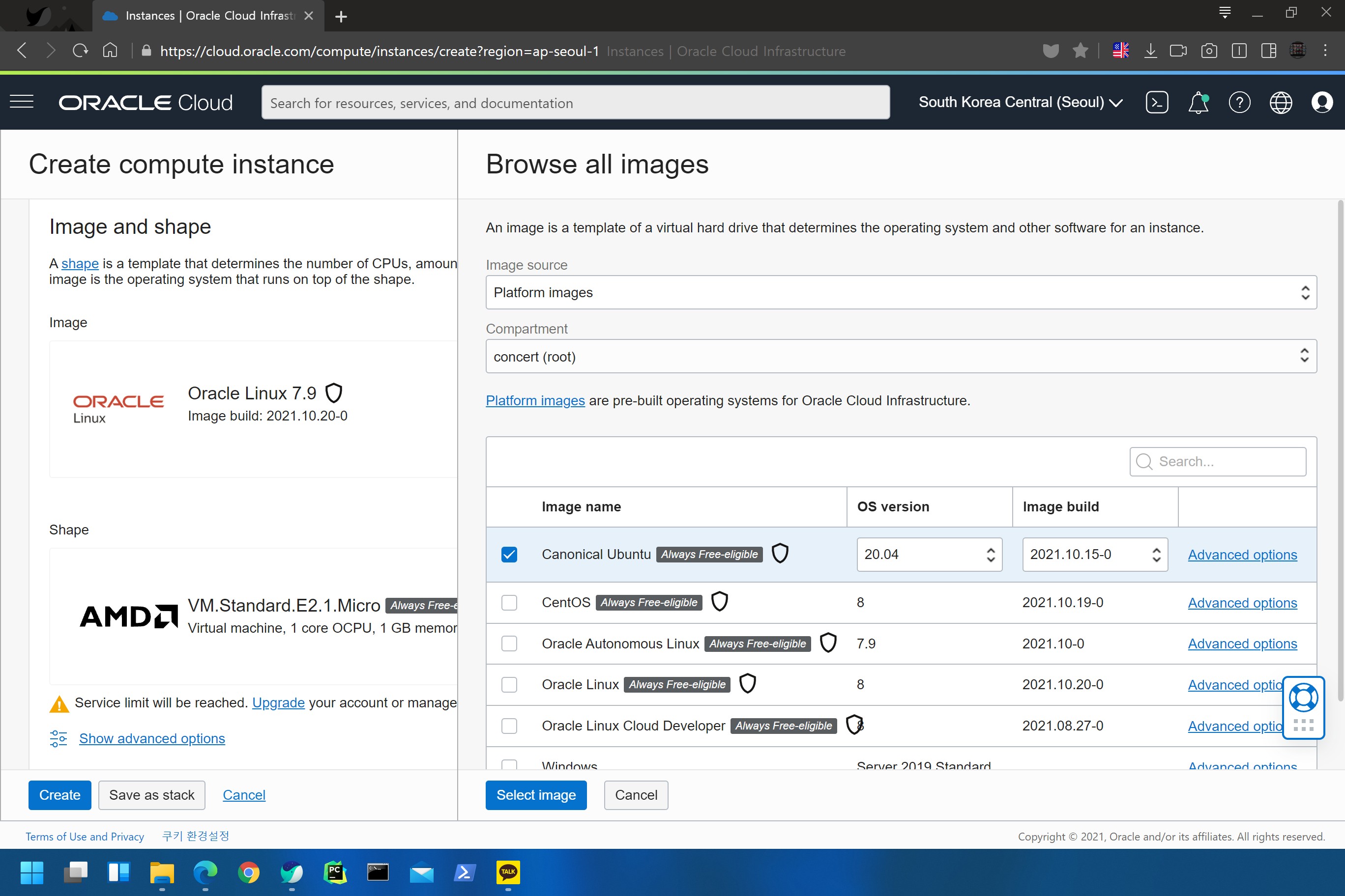 Always Free-eligible 표시가 된 아무 OS나 선택하면 되는데, 여기에서는 우분투 최신판인 Ubuntu 20.04 를 선택하고 아래 Select image 버튼을 누른다.