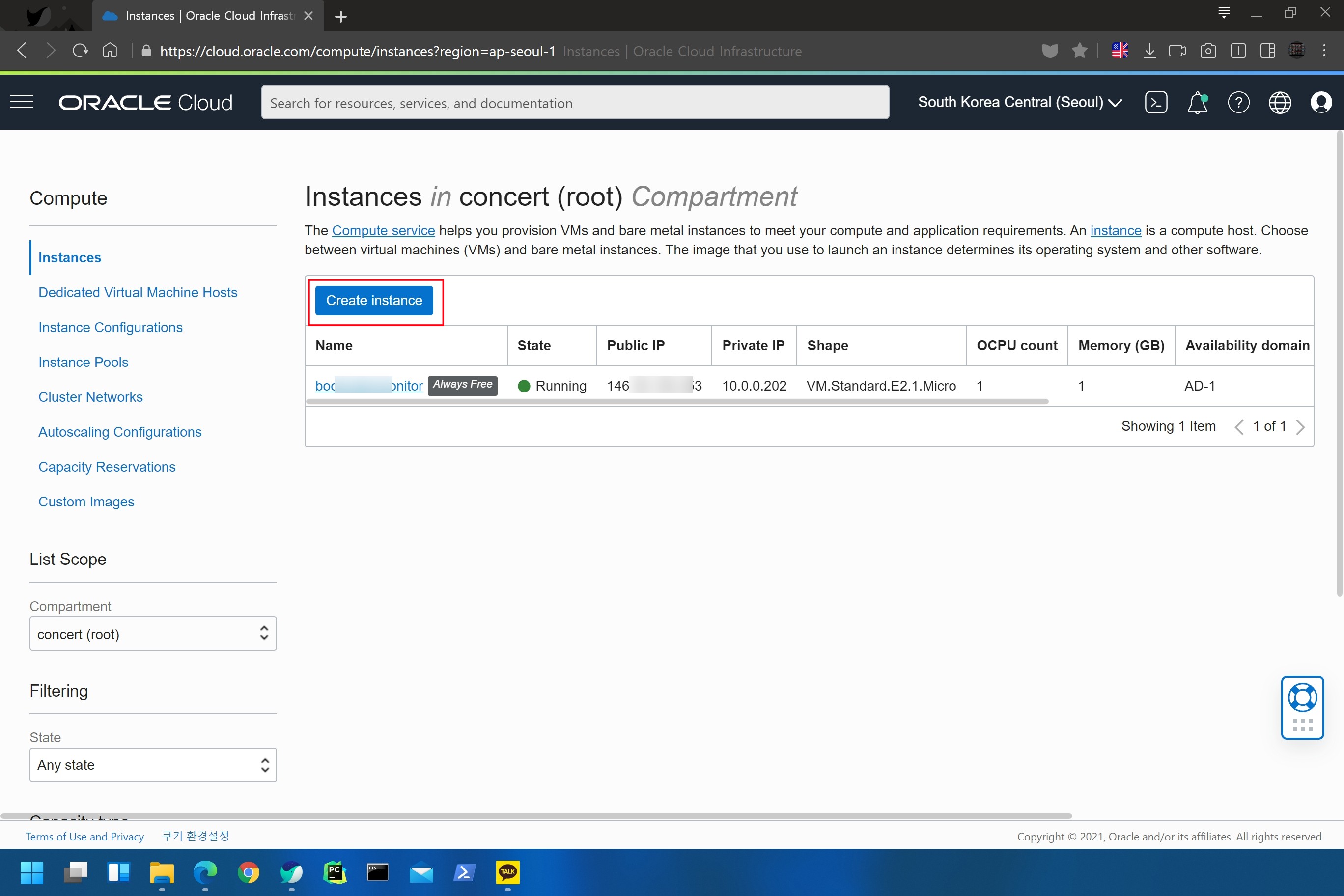 Compute → Instances 를 차례로 클릭해 아래 화면에 진입한다.