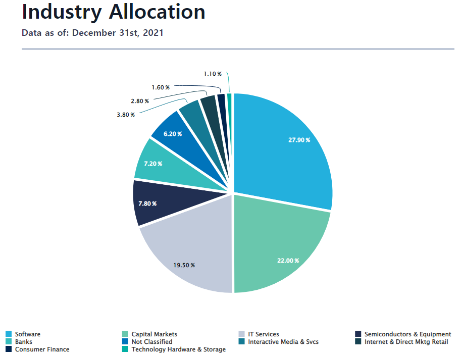 보유종목의 섹터 분산을 보면, IT관련 기업이 가장 많고, 가상자산 유동화를 위한 금융 기관이 뒤를 따르고 있습니다.