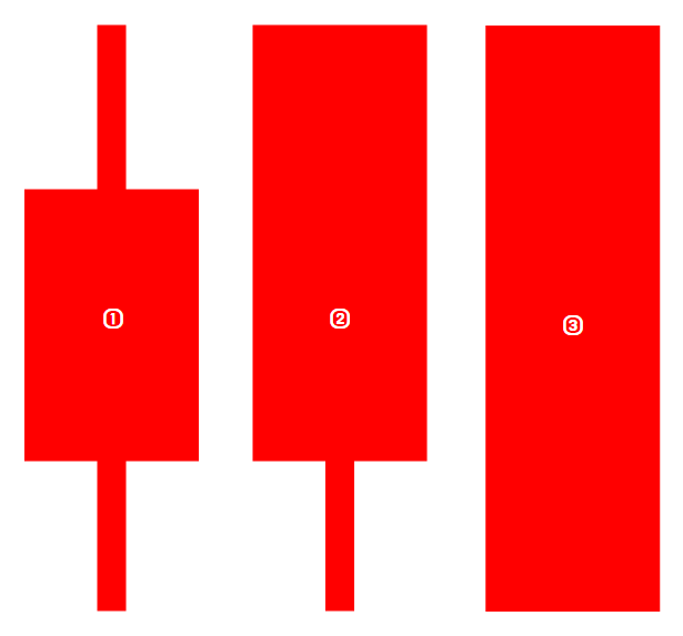 답은 ③. 캔들의 차이는 꼬리와 몸통의 크기에 있다. 캔들에서 꼬리는 밀당이다. 꼬리가 길수록 매수와 매도가 밀당을 더 많이 한 것이다. ①은 하루종일 오르락내리락 하다가 중상부근에서 마감한 캔들이고, ②는 최고가에 마감을 하긴 했지만 시가 아래로 빠졌다가 올라온 캔들, ③은 밀당없이 하루 종일 쭉 치고 올라가 최고가로 마감을 한 캔들이다.