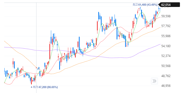 앞서 본 삼성전자 캔들차트의 주황색으로 표시된 부분에서는 파란색으로 표시된 날짜의 주가가 분명 전일보다 상승한 상태로 마감하긴 했지만, 그 당일만을 놓고 봤을때는 훨씬 높은 가격에서 시작했다가 내려온 가격으로 마감한 것이다.