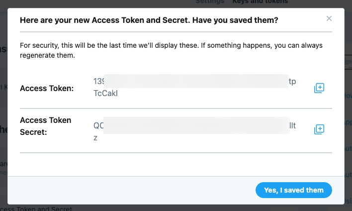 이제 트위터 API를 이용하기 위한 개발자 세팅은 끝났다.